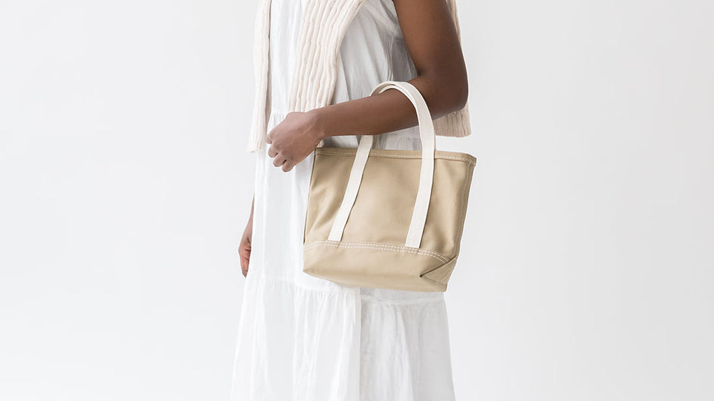 "Built for utility but still effortlessly cool, this industrial-inspired tote is made from water-resistant vinyl-coated fabric. It’s a workhorse with edge"