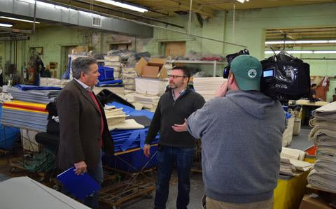 9:25 AM - The interview wraps and the news crew moves on to a factory tour, shooting American manufacturing in action.